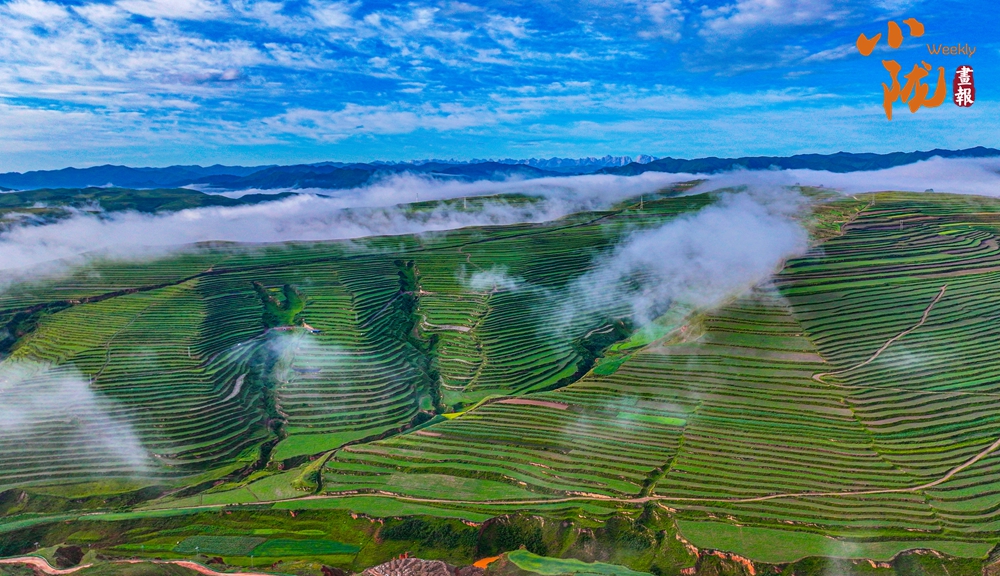 萬畝碧綠的梯田從山腳盤繞著直至山頂,高低錯落,層層疊疊伸向遠(yuǎn)方,遠(yuǎn)遠(yuǎn)望去,像“條縷清晰”的調(diào)色板,在藍(lán)天白云的打扮下,壯現(xiàn)絢爛。