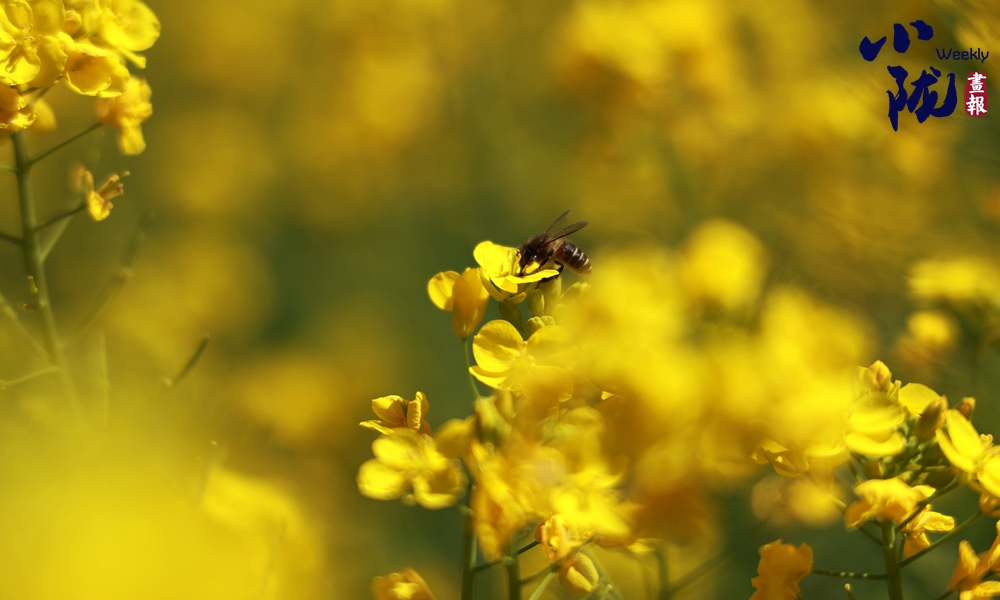 山坡上,黃澄澄、金燦燦,油菜花綻開了美麗的容顏,似一朵彩霞從碧空灑落下來(lái),又像一條黃色的綢緞在大地上飄舞,璀璨奪目。