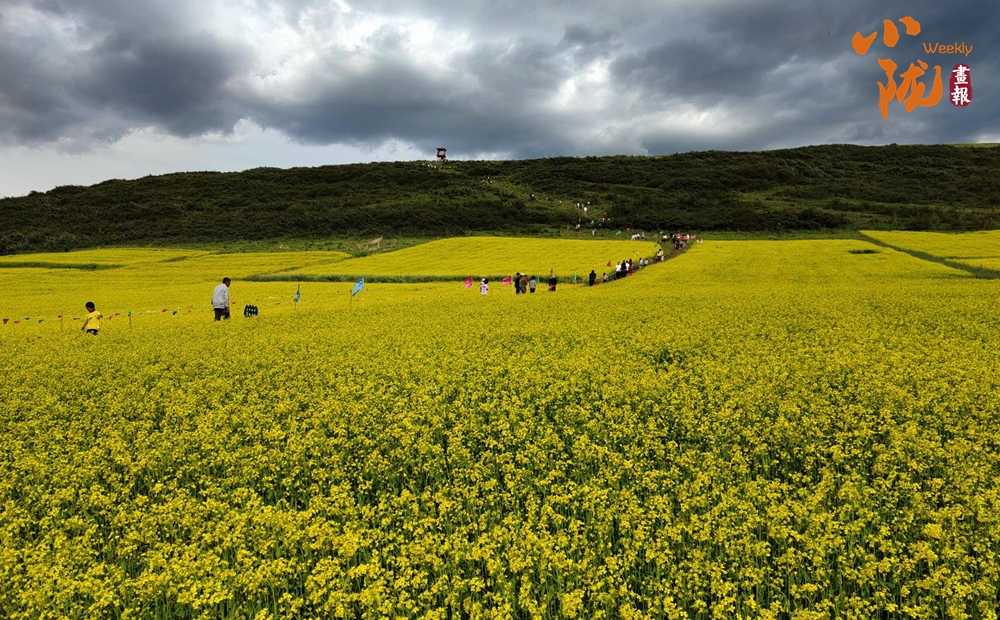 花田黃綠相映,亮如金箔、金黃欲滴、燦爛耀眼。淡淡的花香在蒙蒙細(xì)雨中彌漫了整個(gè)山間田野,游客尋香而來(lái)暢游在花的海洋,感受綠水青山的氣息。