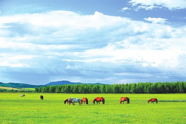 置身草原,高遠(yuǎn)空曠的天空下面,是明凈遼闊的草場,白色的羊和黑色的牛像灑落在草叢中的白珍珠和黑珍珠,一頂頂帳篷點綴其間,不遠(yuǎn)處,有游人騎在馬背上,優(yōu)哉游哉,或拍照或奔馳。這里一年四季景色都十分迷人:春天山花爛漫,姹紫嫣紅,如煙如夢;夏季綠草如茵,碧波浪涌,養(yǎng)心養(yǎng)眼;秋天云纏霧繞,層林盡染,美麗迷人;冬天銀裝素裹,瓊花玉樹,一派北國風(fēng)光。