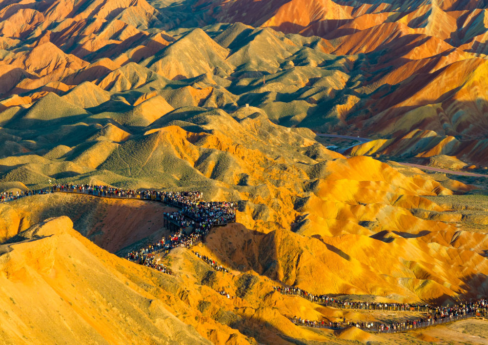 入秋以來(lái),甘肅省張掖市臨澤縣七彩丹霞景區(qū)迎來(lái)游客高峰。丹霞地貌色彩艷麗、造型奇特,使游客仿佛置身畫境,令人流連忘返。
