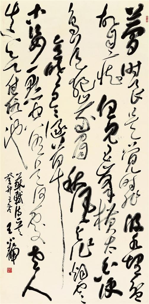 隴南有著得天獨(dú)厚的碑學(xué)資源,以《西狹頌》為代表的碑刻見證了隴南金石碑學(xué)的延續(xù)。王小靜書法中的篆隸素養(yǎng)即來自于此,她大量臨習(xí)金文、漢碑,取其古拙之趣,將碑學(xué)強(qiáng)調(diào)的線條運(yùn)用在草書中,涵養(yǎng)了草書的內(nèi)韻,在澎湃開張的草書體態(tài)中顯示出了厚重的體積感和塊面感,一張一弛之間將一種真正源于內(nèi)心對草書的熱愛凝結(jié)于紙面。從內(nèi)心情感對草書的萌動(dòng)到草書創(chuàng)作進(jìn)入自由抒情階段,這是一次漫長的學(xué)習(xí)之旅。王小靜一直在這條路上奮進(jìn),至今仍然堅(jiān)持臨摹古代經(jīng)典,尤其注重把對篆隸的臨摹推向深入。她認(rèn)為,不斷深入古代經(jīng)典,從傳統(tǒng)中尋找個(gè)人的創(chuàng)新空間,才是有價(jià)值的創(chuàng)新。