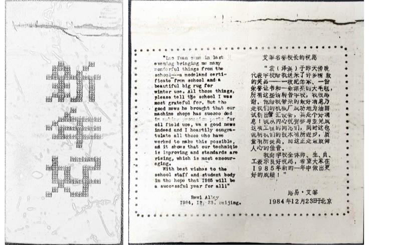 證書是由石油工業(yè)部培黎石油技校申報(bào)的。1984年12月30日,培黎石油技校自制的新年賀卡內(nèi)頁用中英文印上了名譽(yù)校長艾黎的祝愿:
