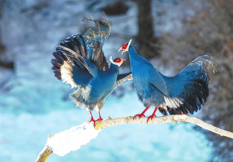 藍(lán)馬雞是珍稀名貴的禽類,頭側(cè)緋紅,耳羽簇白色、突出于頸部頂上,通體藍(lán)灰色,中央尾羽特長而翹起,尾羽披散下垂如馬尾,故名藍(lán)馬雞。冬日里,藍(lán)馬雞成群飛落山腳覓食,藍(lán)羽丹頂行走在雪地上格外搶眼。數(shù)量繁多的藍(lán)馬雞是祁連山野生山地雞的“顏值擔(dān)當(dāng)”。覓食時(shí),藍(lán)馬雞常用爪刨挖林中空地苔蘚和林緣草地,尋找掉落的云杉種子。刨食的過程會讓土壤松動(dòng),便于種子生根發(fā)芽,促進(jìn)林區(qū)植物天然更新。