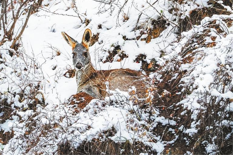 攝影師鏡頭下,一只馬麝安然臥在雪地上,它的耳朵偶爾會輕輕抖動(dòng)一下,像是在用心傾聽著風(fēng)中傳來的細(xì)微聲響。它優(yōu)美的身形與周圍的景色完美融合在一起,寧靜而祥和。