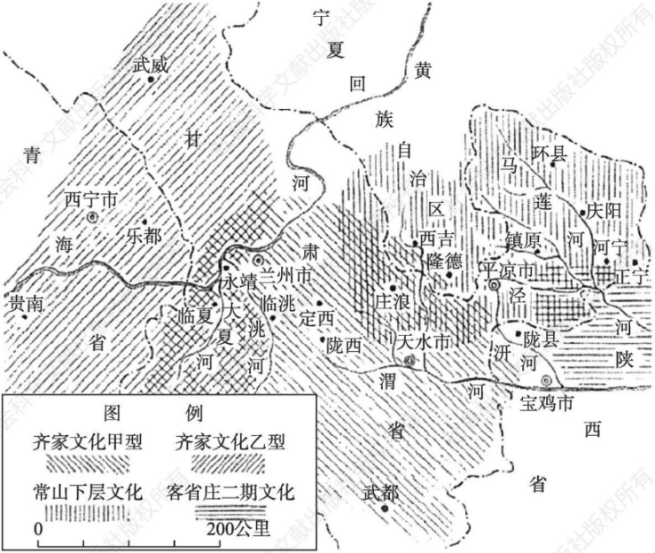 常山下層文化是黃河中上游新石器時(shí)代晚期的重要文化遺存,最早發(fā)現(xiàn)于甘肅省鎮(zhèn)原縣常山遺址而得名。胡謙盈先生認(rèn)為其主要分布在西北黃土高原東部的涇、渭兩河流域上游區(qū)域,其分布范圍東至子午嶺西側(cè),西至鳥(niǎo)鼠山東側(cè)的渭源縣,北至寧夏回族自治區(qū)南部,南至陜西省彬縣及甘肅天水地區(qū)南部。學(xué)界普遍認(rèn)為,它是由仰韶文化晚期發(fā)展而來(lái),同時(shí)也是齊家文化的重要源頭之一。依據(jù)碳14測(cè)定,其年代約為公元前2930±180年,相對(duì)年代晚于仰韶文化,早于先周文化,是西北新石器時(shí)代晚期的文化紐帶,在研究中國(guó)史前文化演進(jìn)中占據(jù)重要地位。