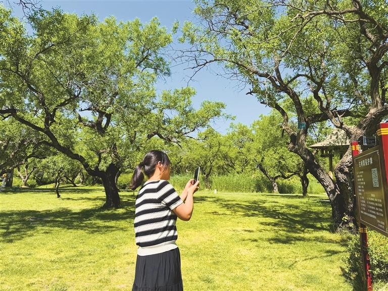 行至平沙落雁,路旁綠草之上,一株百年文冠果樹上果實累累,宛如哨兵般靜靜守候,為熱鬧的街市增添了幾分寧靜。在綠色公園內(nèi),一株700年樹齡的古國槐枝繁葉茂。復(fù)古的支架穩(wěn)穩(wěn)支撐著枝干,既確保它在歲月中安然生長,又透出滄桑之感。花崗巖圍欄環(huán)繞四周,其上雕刻的荷葉荷花圖案栩栩如生,“愛護樹木”“保護生態(tài)”等文字清晰可見,無聲地倡導(dǎo)著人們保護環(huán)境、愛護植物。退休教師王淑芬正帶著小孫女玩耍,她笑著說:“這兒空氣好,景色美,每天帶孩子來親近古樹,也是在給她種下愛護自然的種子。”游客的歡笑聲、孩童的嬉戲聲與清脆的鳥鳴聲交織在一起,為古樹增添了別樣的活力。