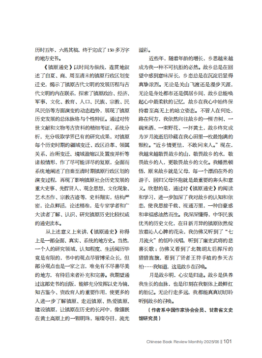 從上述意義上來講,《鎮(zhèn)原通史》稱得上是一部全面、真實、系統(tǒng)的地方史。當(dāng)然,一個人的研究領(lǐng)域、認(rèn)知程度、生活閱歷畢竟是有限的,書中的觀點(diǎn)盡管博采眾長,但部分觀點(diǎn)也是一家之言,難免有不盡善盡美的地方,有待后來者補(bǔ)充和完善。我期望通過這部史書的出版,能夠充分發(fā)揮以史為鏡、知古鑒今、資政育人的重要作用,使更多的人進(jìn)一步了解鎮(zhèn)原、走近鎮(zhèn)原、熱愛鎮(zhèn)原、建設(shè)鎮(zhèn)原,讓鎮(zhèn)原在歷史的長河中,像鑲嵌在黃土高原上的一顆明珠,璀璨奪目,流光溢彩。