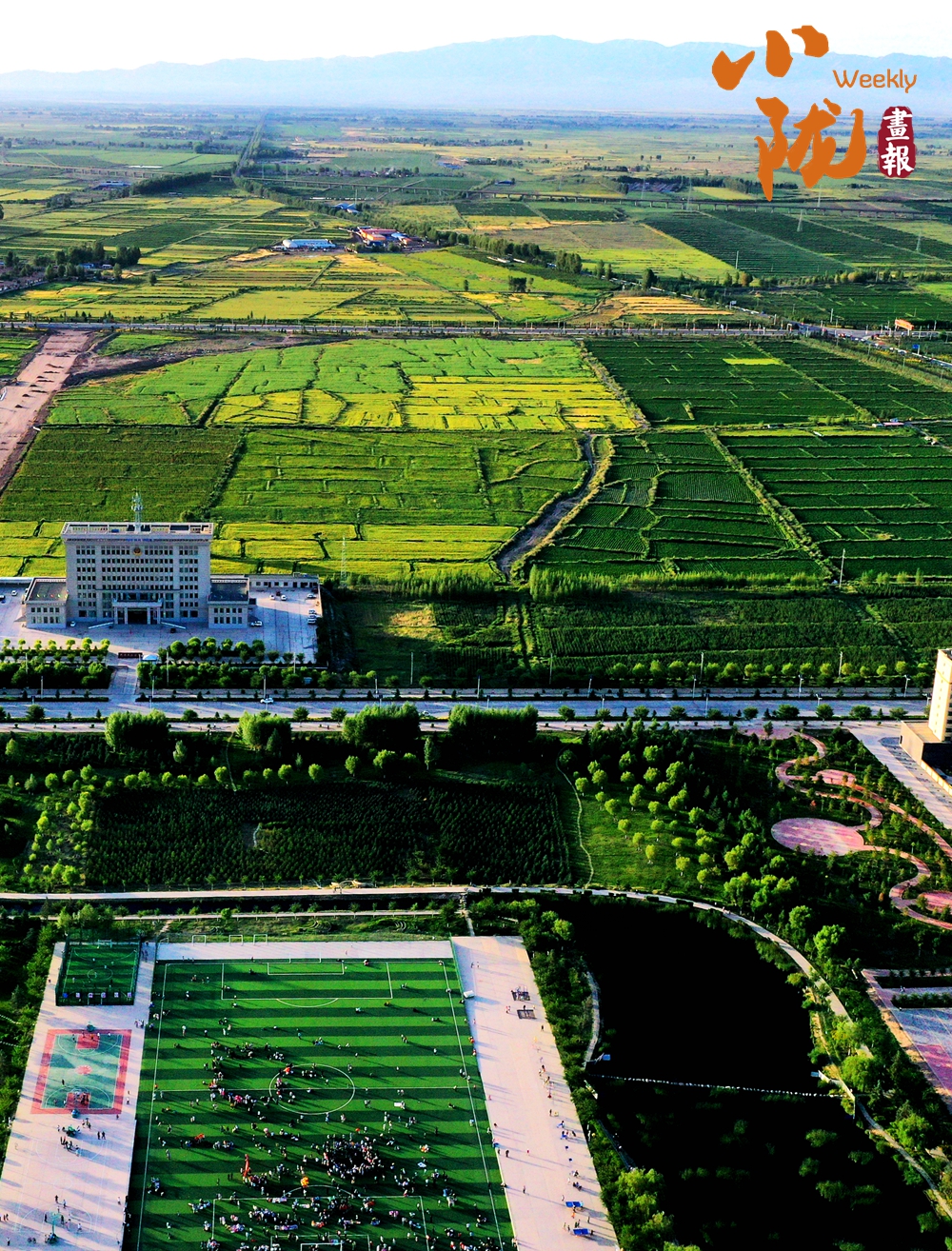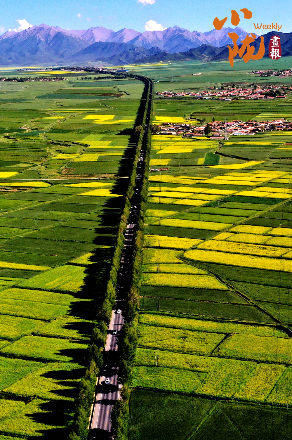廣袤無(wú)邊的田野生機(jī)盎然,金黃色的油菜花夾雜著一塊塊碧綠色的麥田,好像給大地鋪上了一層五顏六色的大地毯。漂亮的民居鑲嵌其中,與祁連山相互輝映,在陽(yáng)光下美麗極了!