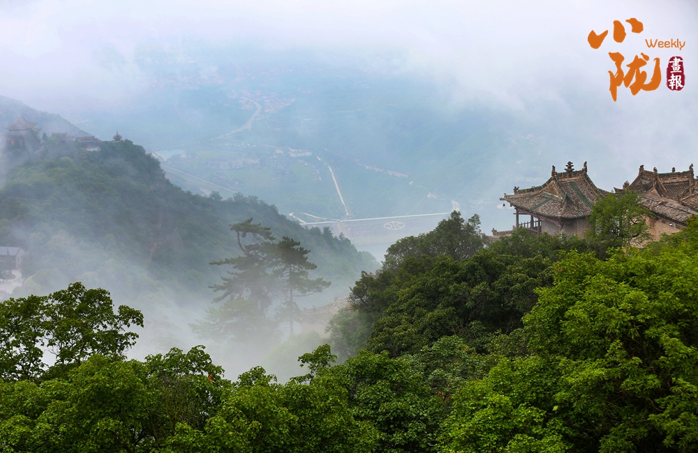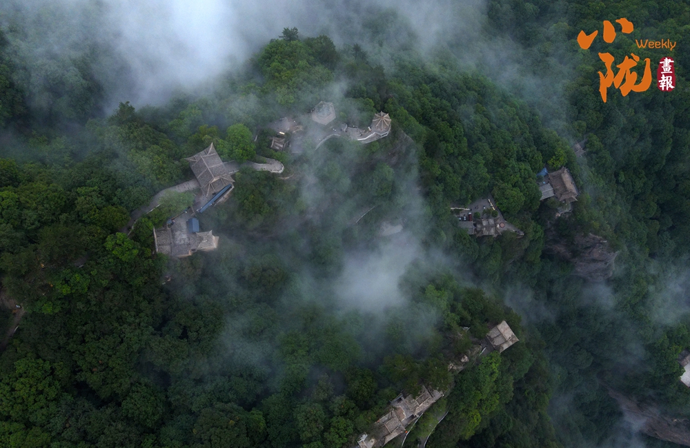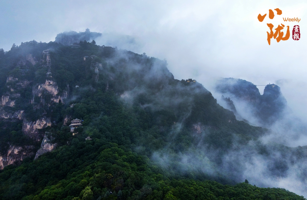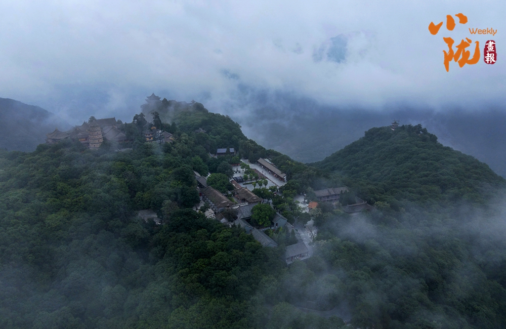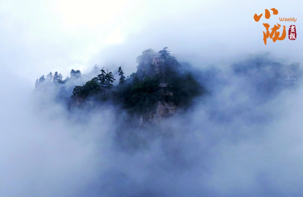 云霧繚繞,山水與寺廟隱現(xiàn),營(yíng)造出神秘且令人向往的視覺效果。站在半山腰,背靠懸崖,深邃不可見底,不禁生出“山登絕頂我為峰”的豪情。然而,世間萬(wàn)物,瞬息萬(wàn)變,是否成為峰巔之巔又何妨?