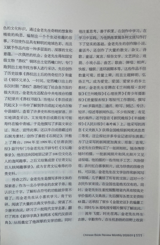 傳奇之四,金老先生是撰寫多種文體的探索者。作為一名小學畢業(yè)的農(nóng)家子弟,能認識上千字,了解標點符號的功能就非常不錯了,而金老先生從小喜歡學習,肯于鉆研,閱讀了大量的古典文學作品,背誦了不少唐宋詩詞,研習了一批現(xiàn)代文學名著,翻爛了兩本《新華字典》和兩本《現(xiàn)代漢語詞典》,從而奠定了他深厚的文學功底。同時他注重思考,善于積累,在創(chuàng)作中學習,在學習中實踐,為他熟練掌握各種文體寫作打下了堅實的基礎。金老先生的創(chuàng)作除小說、童話外,還創(chuàng)作了大量的散文、雜文、詩歌、童謠、寓言、報告文學、文藝評論、戲劇、小戲小品、曲藝、歌曲、彈唱、相聲、快板、楹聯(lián)、連環(huán)畫腳本等,這些作品不但數(shù)量可觀、質(zhì)量上乘,而且主題鮮明、弘揚正氣,成為愛黨、愛國、愛家鄉(xiāng)的鄉(xiāng)土教材。金老先生受聘在《蘭州晚報·農(nóng)村版》《蘭州晚報》《心理世界》《青少年攝影報》《質(zhì)量服務報》等報刊工作期間,撰寫了300多篇消息、通訊、特寫、側(cè)記、專訪、短評、綜述等新聞作品,不少有深度、有見地的稿件,還刊登在《新民晚報》《羊城晚報》《人民日報》(海外版)上。他采寫的消息《義犬救人》獲得全國晚報新聞獎消息類二等獎,這讓報社許多專業(yè)記者好生羨慕。為了讓采寫的新聞更加真實、形象、直觀,金老先生自費購買了一部照相機,隨身攜帶隨時拍攝,一批新聞照片和風光照片又見諸報端。他拍攝的一些傳統(tǒng)手工藝、風物景觀、農(nóng)村紅白喜事照片,成為珍貴的圖像資料。可以說,金老先生在文學創(chuàng)作和新聞寫作領域,幾乎囊括了所有的文體,這對一個農(nóng)民作家來說,在全國也是絕無僅有的。同時,金老先生注重挖掘整理省內(nèi)具有較高史學價值的人文典故,先后撰寫各類文史資料83篇,還承擔了家鄉(xiāng)《金崖史話》的編纂工作,同時為16部電視專題片撰寫了解說詞。
