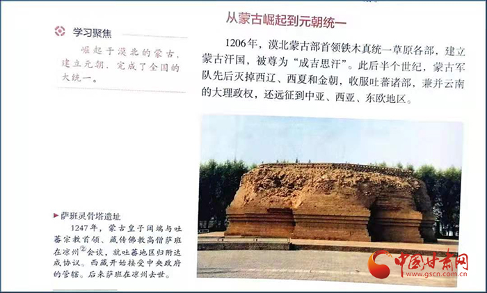 在高一歷史課本第56頁(yè)中外歷史綱要(上)第三單元有一段記錄“涼州會(huì)談”的簡(jiǎn)要文字:“1247年,蒙古皇子闊端與吐蕃宗教首領(lǐng)、藏傳佛教高僧薩班在涼州會(huì)談,就吐蕃地區(qū)歸附達(dá)成協(xié)議。西藏開(kāi)始接受中央政府的管轄。后來(lái)薩班在涼州去世。”文字右上角是一張薩班靈骨塔遺址配圖。