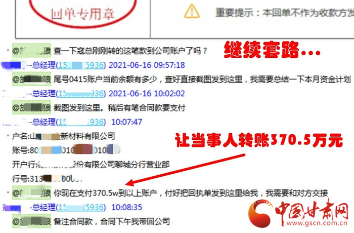 據(jù)了解,6月16日上午9時20分左右,安寧區(qū)某公司財務人員岳先生收到一封由“公司股東”發(fā)來的電子郵件,在郵件中推送了一個新建的QQ工作群,岳先生沒有多想就加入了此群。不久后,詐騙分子在此QQ群中冒充該公司法人和另外一名財務人員對岳先生下達指令,要求其向對方指定銀行賬戶轉賬合同款370.5萬元。