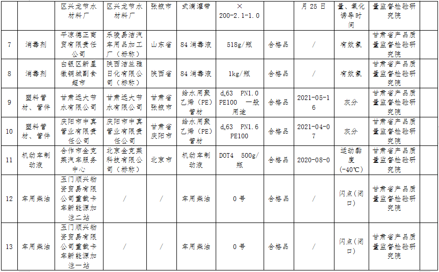 對抽檢發(fā)現(xiàn)的不合格產(chǎn)品,甘肅省市場監(jiān)管局已責成各市(州)市場監(jiān)管部門嚴格按照《產(chǎn)品質(zhì)量法》《產(chǎn)品質(zhì)量監(jiān)督抽查管理暫行辦法》等規(guī)定,認真做好后處理工作,并將不合格產(chǎn)品生產(chǎn)(經(jīng)銷)企業(yè)后處理情況在規(guī)定時限內(nèi)上報。