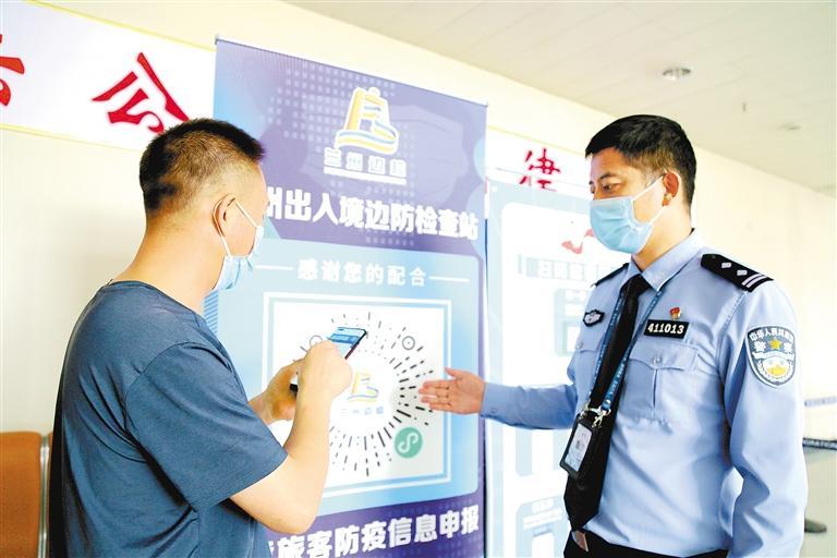 王金明向出境乘客介紹防疫要求。 蘭州出入境邊防檢查站供圖