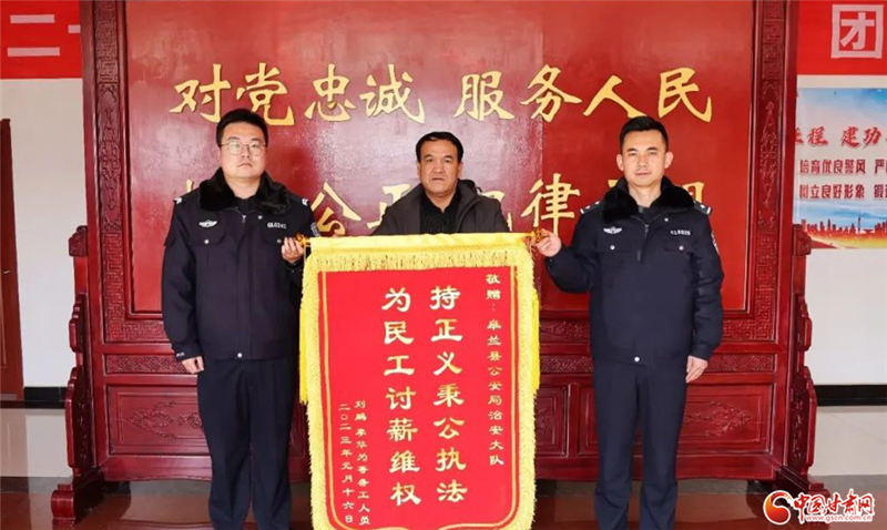 中國(guó)甘肅網(wǎng)2月3日訊(本網(wǎng)記者 程?。?月2日,劉先生代表20余名工友將一面印有“持正義秉公執(zhí)法,為民工討薪維權(quán)”的鮮紅錦旗送到了蘭州市皋蘭縣公安局,以此表達(dá)對(duì)縣局治安管理大隊(duì)民警幫其辛苦討要工資的感謝。