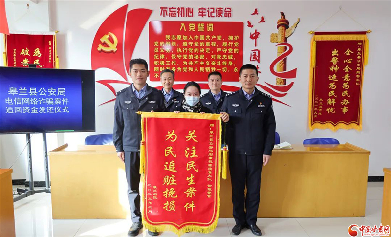 “沒想到還能追回被騙的錢,真心感謝皋蘭縣公安局的民警們。”返還儀式上,楊女士領(lǐng)回被騙資金,連聲道謝,并向辦案民警送上了一面印有“關(guān)注民生案件 為民追贓挽損”的錦旗,感謝民警全力偵辦案件,為自己挽回?fù)p失。