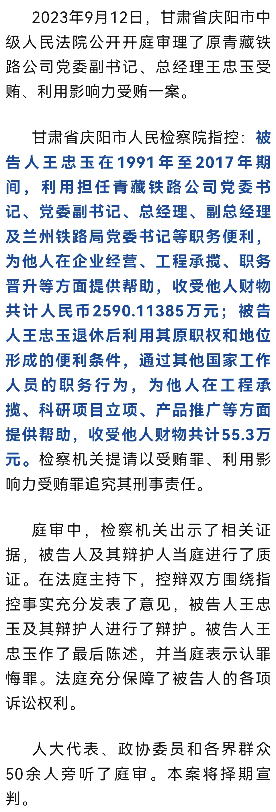 收受他人財(cái)物2600多萬(wàn)元!原青藏鐵路公司黨委副書(shū)記、總經(jīng)理王忠玉案一審開(kāi)庭