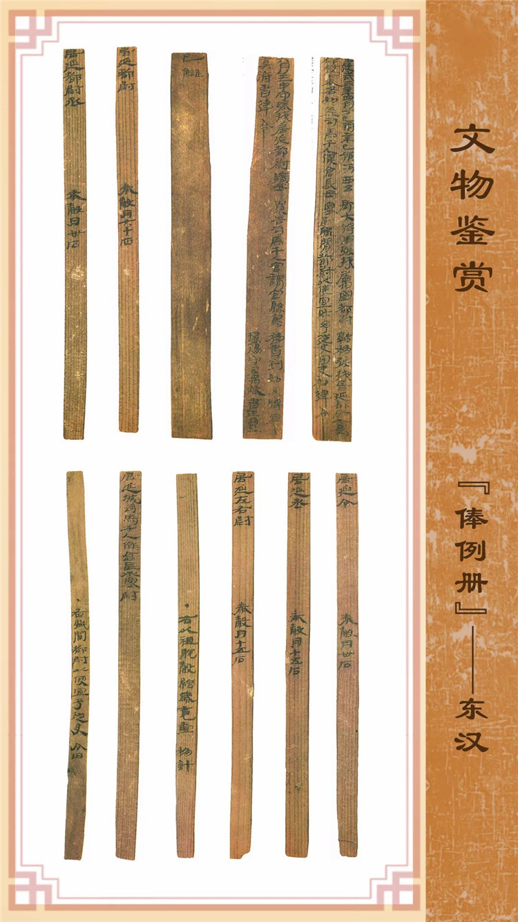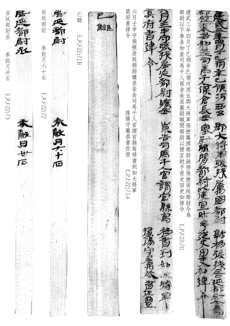 1974年8月出土于甲渠候官遺址第22號房址內(nèi)。簡冊由10枚簡組成,每簡長22.8厘米,前兩簡寬2.5厘米,其余8簡寬1.4厘米。全文200字。內(nèi)容為東漢建武三年(公元25年)竇融統(tǒng)治河西期間留下的一份完整的財政文書。簡文是關(guān)于居延都尉府吏員奉谷標(biāo)準(zhǔn)的通知,由領(lǐng)河西五郡大將軍張掖屬國都尉竇融幕府下發(fā),簡言“如律令”可知其指令具有法律效力。