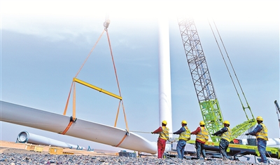 甘肅省高臺縣境內有戈壁荒漠2000多平方公里,近年來憑借風光資源優(yōu)勢,發(fā)力新能源產業(yè)賽道。圖為該縣某新能源風力發(fā)電項目建設現(xiàn)場,工作人員正在安裝風力發(fā)電機。新華社發(fā)