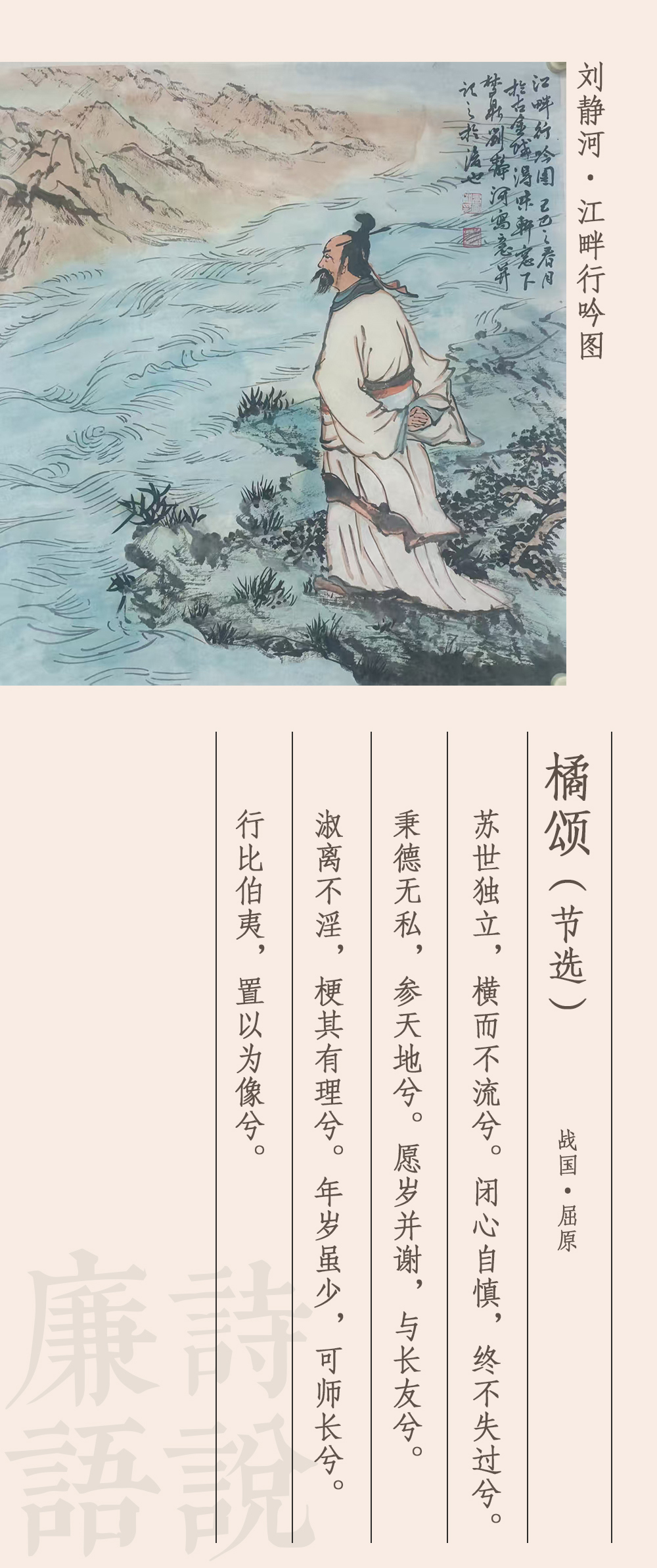 《橘頌》被譽(yù)為中國(guó)最早的詠物詩(shī)。據(jù)考證,屈原在流放之初,苦悶憤激,看到南國(guó)的橘樹(shù),心有所觸,將橘樹(shù)人格化,賦予其君子仁人的品格,寫下了這首詩(shī)。詩(shī)分兩部分,前半部分寫實(shí),刻畫了橘樹(shù)的生長(zhǎng)習(xí)性和枝葉花果,后半部分抒情議論,托物言志,橘人合一,情景交融。這里節(jié)選了后半部分,大意如下:清醒立世啊不隨波逐流,小心謹(jǐn)慎啊過(guò)失從不留,沒(méi)有私欲啊與天地比儔,我與你同生死啊永結(jié)為好友,你形象美好啊耿直作一流,你風(fēng)華正茂啊堪為好師長(zhǎng),你高潔比伯夷啊榜樣最優(yōu)秀。