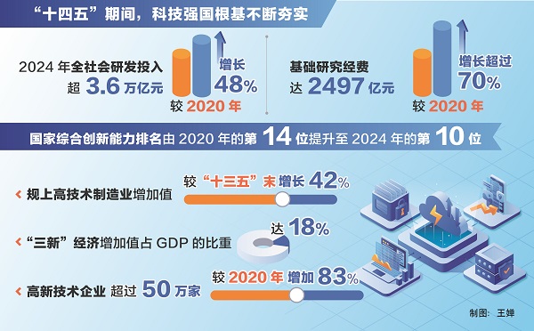 “這五年,科技創(chuàng)新能力穩(wěn)步提升,科技強國根基不斷夯實。”陰和俊說,我國科技投入持續(xù)增加,2024年全社會研發(fā)投入超3.6萬億元,較2020年增長48%;基礎(chǔ)研究經(jīng)費達2497億元,較2020年增長超過70%,在量子科技、生命科學(xué)、物質(zhì)科學(xué)、空間科學(xué)等領(lǐng)域取得一批重大原創(chuàng)性成果;國家實驗室體系建設(shè)穩(wěn)步推進,國家科研機構(gòu)、高水平研究型大學(xué)科研能力不斷提升,科技領(lǐng)軍企業(yè)加快培育成長;北京、上海、粵港澳大灣區(qū)國際科創(chuàng)中心支撐引領(lǐng)和輻射帶動作用不斷增強,深圳-香港-廣州躍居全球百強創(chuàng)新集群榜首;國家綜合創(chuàng)新能力排名由2020年的第14位提升至2024年的第10位。