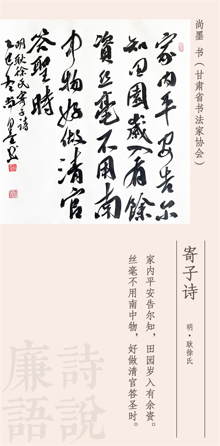 耿庭柏少年得志,20歲即中進(jìn)士、任知縣,可謂春風(fēng)得意。但耿徐氏卻并沒有一味沉溺于兒子帶來的榮耀,而是很冷靜、及時(shí)地寫了這首詩寄給他,給予諄諄告誡。詩句很平實(shí),意思很明確,家中一切都好,田園的收入完全能夠養(yǎng)活家人。所以山陰(即今紹興)這個(gè)富庶之地的一絲一毫你都不可非法攫取來寄給我,只要你好好地做個(gè)清官來報(bào)答國家和黎民就足夠了。這首詩當(dāng)時(shí)即傳誦一時(shí),后來還被收入清代沈德潛編纂的《明詩別裁集》、宋弼編纂的《山左明詩鈔》等詩歌選集中。耿家為書香門第,科甲鼎盛,先后出過七個(gè)進(jìn)士,但他們的詩詞作品都沒有流傳下來,反而是耿徐氏的這首詩為家族撐了門面。