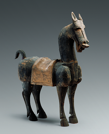 漢代,武威市磨嘴子漢墓出土。高87厘米,長(zhǎng)72厘米。木馬形體高大,張嘴嘶鳴,四足直立,作佇立狀。通體涂黑,用刀刻出眼、鼻、唇,尾后舉下垂。馬鞍用白粉涂底,上以黑色勾畫(huà)出云氣紋。整體造型雄渾質(zhì)樸,生動(dòng)傳神。