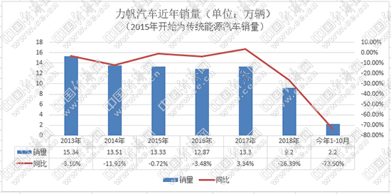2006年,力帆推出首款轎車力帆520,新車不足5萬元的售價在當時引發(fā)關注,月銷量一度達到5000輛。2013年,力帆年銷售汽車15.34萬輛,成為汽車界的一匹黑馬。然而,好景不長。自2016年開始,力帆汽車進入下行趨勢,目前更是步履維艱。力帆產銷快報顯示,2019年1-10月,力帆傳統(tǒng)乘用車累計銷售2.2萬輛,同比下滑73.5%,10月僅銷售29輛;新能源累計銷售2458輛,同比下降65.42%,10月僅銷售423輛。