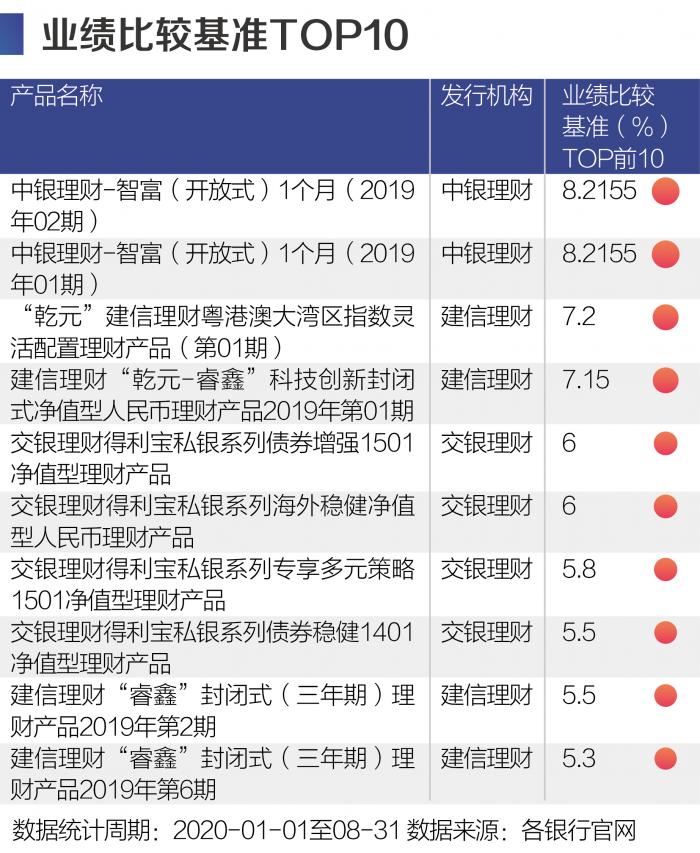 (注:對(duì)于少數(shù)非固定報(bào)價(jià)的產(chǎn)品,為了便于統(tǒng)一對(duì)比,課題組對(duì)數(shù)據(jù)進(jìn)行了量化處理,針對(duì)區(qū)間報(bào)價(jià)的業(yè)績(jī)比較基準(zhǔn)數(shù)據(jù)選取平均值,針對(duì)對(duì)標(biāo)其他指數(shù)收益的業(yè)績(jī)比較基準(zhǔn)折算為該產(chǎn)品成立日相關(guān)指數(shù)的收益率,并按照產(chǎn)品說(shuō)明書(shū)中的計(jì)算方式折算成業(yè)績(jī)比較基準(zhǔn)。)