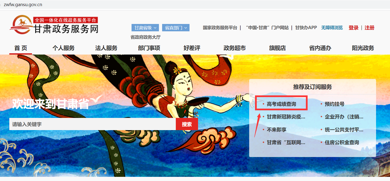 打開(kāi)“甘肅政務(wù)服務(wù)網(wǎng)”https://zwfw.gansu.gov.cn/,在首頁(yè)“推薦及訂閱服務(wù)”欄目,點(diǎn)擊“高考成績(jī)查詢”進(jìn)入查詢頁(yè)面,輸入考生號(hào)、身份證號(hào)即可查詢。