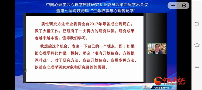 本次會議以“新征程中的中國質(zhì)性心理學(xué)”為主題,由中國心理學(xué)會心理學(xué)質(zhì)性研究專業(yè)委員會、西北師范大學(xué)共同主辦,西北師范大學(xué)心理學(xué)院和甘肅省心理學(xué)會承辦。來自美國、南非以及國內(nèi)北京師范大學(xué)、蘇州大學(xué)、華東師范大學(xué)、輔仁大學(xué)等高校和科研機構(gòu)的400余位學(xué)者,通過線上線下方式參加。