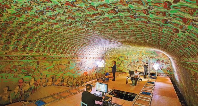 莫高窟第148窟數(shù)字化采集工作現(xiàn)場。敦煌研究院在國內(nèi)率先進行文物數(shù)字化的探索研究,形成了一套科學(xué)的壁畫彩塑數(shù)字化技術(shù),制定了14項文物數(shù)字化保護技術(shù)標(biāo)準(zhǔn)與規(guī)范。