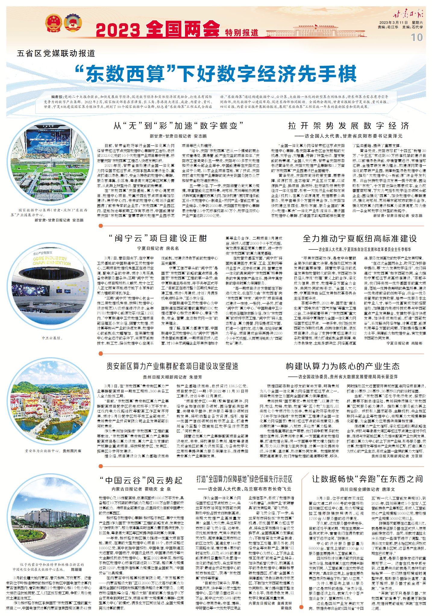 編者按:黨的二十大報(bào)告提出,加快發(fā)展數(shù)字經(jīng)濟(jì),促進(jìn)數(shù)字經(jīng)濟(jì)和實(shí)體經(jīng)濟(jì)深度融合,打造具有國(guó)際競(jìng)爭(zhēng)力的數(shù)字產(chǎn)業(yè)集群。2022年2月,國(guó)家相關(guān)部委在京津冀、長(zhǎng)三角、粵港澳大灣區(qū)、成渝、內(nèi)蒙古、貴州、甘肅、寧夏8地建設(shè)國(guó)家算力樞紐節(jié)點(diǎn),規(guī)劃了10個(gè)國(guó)家數(shù)據(jù)中心集群,標(biāo)志著“東數(shù)西算”工程正式全面啟動(dòng)。“東數(shù)西算”通過(guò)構(gòu)建數(shù)據(jù)中心、云計(jì)算、大數(shù)據(jù)一體化的新型算力網(wǎng)絡(luò)體系,將東部算力需求有序引導(dǎo)到西部,優(yōu)化數(shù)據(jù)中心建設(shè)布局、促進(jìn)東西部協(xié)同聯(lián)動(dòng)。全國(guó)兩會(huì)期間,甘肅日?qǐng)?bào)聯(lián)合寧夏日?qǐng)?bào)、貴州日?qǐng)?bào)、四川日?qǐng)?bào)、內(nèi)蒙古日?qǐng)?bào)開展聯(lián)動(dòng)報(bào)道,展現(xiàn)“東數(shù)西算”工程實(shí)施一年來(lái)的最新探索和實(shí)踐成果。