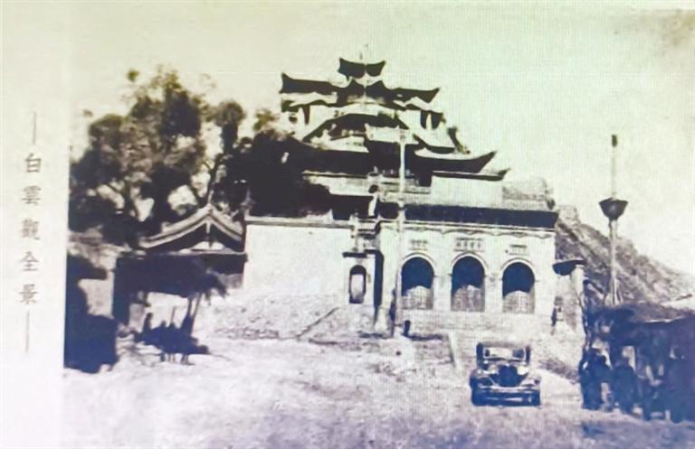 1935年5月,邵元沖考察西北途經(jīng)蘭州,專程赴崔家崖白云觀參訪?!段鞅彪S軺記》載:“依極壽山麓,建白云觀,高三百余級,黃流襟帶,榆柳成蔭,書長無事,凝坐其間,聆水聲潺湲,聽鳥語啾啁,亦足滌塵煩,消炎夏。”邵元沖為此特作《題崔家崖白云觀》詩曰:“玄都峙重崖,清磬林間響。俯瞰大河橫,寒流走混□。柳晚翠煙浮,閑云獨來往。”《西北攬勝》一書中,專門刊載兩幅崔家崖白云觀照片,照片說明曰:“北臨黃河,南接蘭山,形勢雄壯,殿宇倚坡上筑,宏麗精巧,且曲徑回廊,引人入勝,亦蘭垣名勝之一也。” 從老照片中可見,崔家崖白云觀依山而建,頗具氣勢,而且交通便利,邵元沖一行乘坐的小汽車可以直達觀前。