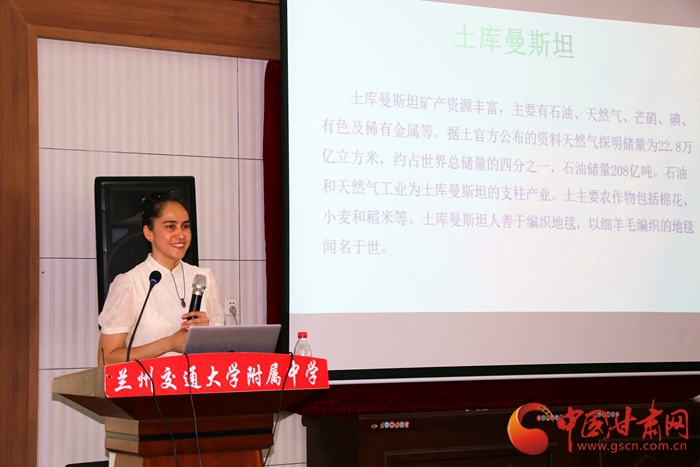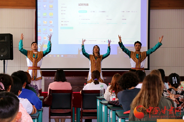 活動中,蘭州交通大學(xué)附屬中學(xué)組織七、八年級用英語表演了詩歌朗誦、話劇、合唱、獨(dú)唱等節(jié)目,來華留學(xué)生代表獻(xiàn)上了土庫曼斯坦傳統(tǒng)舞蹈表演,現(xiàn)場氣氛熱烈。