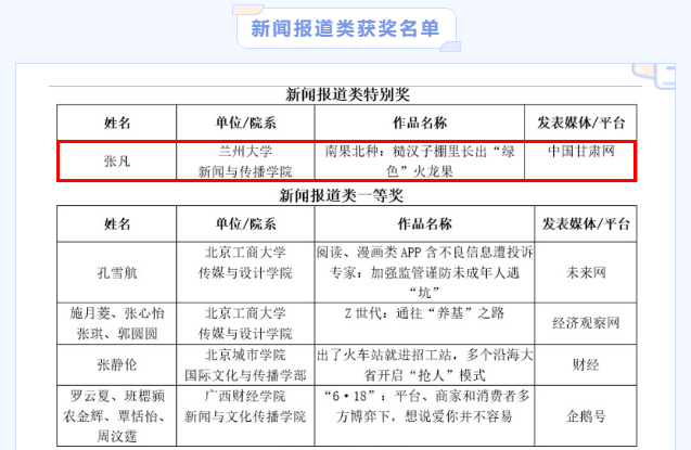 蘭州大學新聞與傳播學院獲獎中,張凡的作品《南果北種!糙漢子棚里種出“綠色”火龍果》在中國甘肅網(wǎng)刊發(fā),系蘭州大學新聞與傳播學院、中國甘肅網(wǎng)聯(lián)合舉辦的第十三屆“重走中國西北角”接力采訪活動新聞作品。