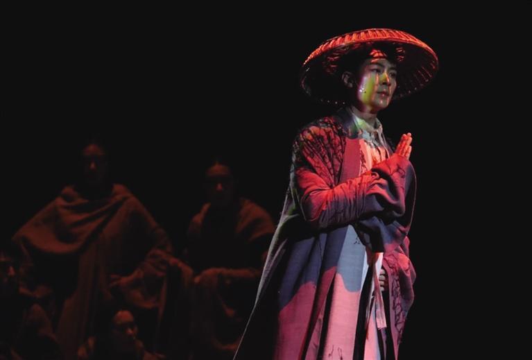 在音樂劇《飛天》的舞臺上,敦煌元素豐富,各色形象躍然而出。無論是對《鹿王本生》《千釘求法》《入海求珠》《舍身飼虎》四則經(jīng)典故事的再現(xiàn),還是九色鹿、烏鴉、勞度叉、枇楞揭梨、公主、善友等各色形象的還原,抑或?qū)Φ?57窟、第275窟、第296窟、第428洞窟等石窟壁畫的描摹再現(xiàn),古今歷史的交疊盡現(xiàn)眼前……敦煌壁畫中那些靜默千年的人物,宛如靈魂覺醒般緩緩浮現(xiàn),穿越了千年的歲月長河,與觀眾進行了一場跨越時空的深情對話。