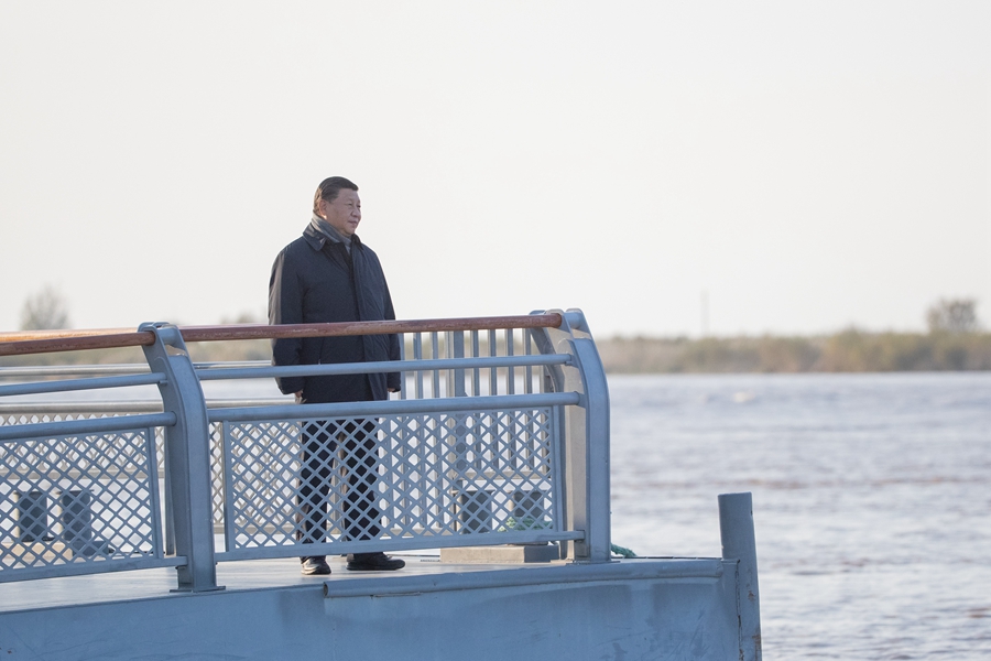 2021年10月20日,中共中央總書記、國家主席、中央軍委主席習(xí)近平在東營市黃河入??诳疾?。新華社記者王曄攝