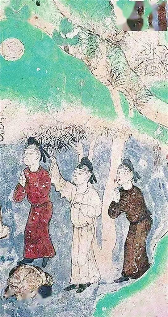 敦煌中秋節(jié)的拜月儀式多由女性來(lái)承擔(dān)。在編號(hào)為P.2838的敦煌文書(shū)《拜新月》中就寫(xiě)道:“況當(dāng)秋景,蓂葉初敷卉,向登新樓上,仰望蟾色光遲回,愿玉兔影媚明鏡匣,參差斜墜橙波美。猶怯怕銜半鉤耳,萬(wàn)家向月下,祝告深深跪……”意思是說(shuō)在中秋之夜,盛裝打扮的女性會(huì)登上專(zhuān)門(mén)搭建的“拜月樓”,帶著精心準(zhǔn)備的獻(xiàn)供物品,代表整個(gè)家族向月神祈求平安喜樂(lè)、健康如意。也有些未婚女子登樓是為祈愿自己未來(lái)婚姻美滿(mǎn)順?biāo)斓?。人們拜月亮就是拜月神,拜月光菩薩。在莫高窟第35窟壁畫(huà)中有一幅“手托日月的十一面觀(guān)音圖”,其中部分畫(huà)面就描繪了當(dāng)時(shí)人們想象的月宮圖景。在莫高窟第384窟壁畫(huà)中也有一幅“月光菩薩圖”:畫(huà)面中的菩薩乘坐在白鵝座上,身著白衣,衣服顏色幾近透明;手持月輪;整個(gè)身體被兩條赭紅色飄帶纏繞,仙氣飄飄!