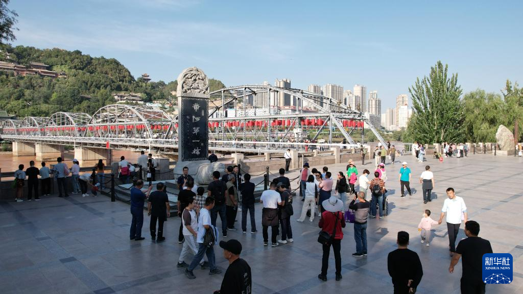 游客在蘭州地標(biāo)——中山橋參觀游覽(9月23日攝,無人機照片)。新華社記者陳斌攝