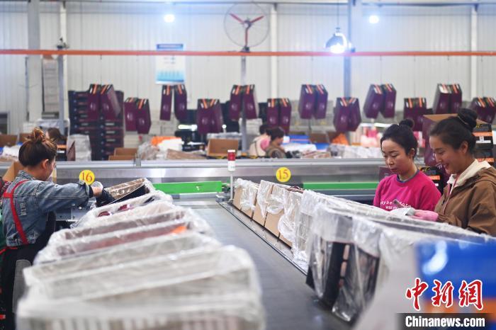 10月21日,在甘肅省天水市秦安縣雪原果品有限公司加工車間,蘋果自動(dòng)化分揀線上工作人員進(jìn)行分揀工作。該生產(chǎn)線每天能處理30噸蘋果,蘋果經(jīng)過(guò)設(shè)備水洗、烘干、稱重等環(huán)節(jié),進(jìn)入不同等次的包裝線,工人們?cè)賹?duì)每顆蘋果進(jìn)行復(fù)檢、貼標(biāo),分裝在不同規(guī)格的包裝箱中。甘肅秦安蘋果總面積61.37萬(wàn)畝,產(chǎn)量86.8萬(wàn)噸,產(chǎn)值55.6億元人民幣,先后從國(guó)內(nèi)科研院所引進(jìn)青砧、M26、ZH5等抗重茬蘋果矮化砧木6個(gè),配合國(guó)家蘋果產(chǎn)業(yè)技術(shù)體系,引進(jìn)長(zhǎng)富2號(hào)、煙富6號(hào)、煙富8號(hào)、瑞香紅等蘋果新品種12個(gè)。中新社記者李亞龍攝