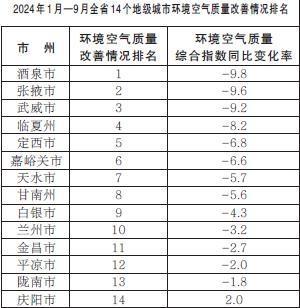 2024年1月—9月,全省14個地級城市環(huán)境空氣質(zhì)量改善情況排名由好到差分別為:酒泉市、張掖市、武威市、臨夏州、定西市、嘉峪關(guān)市、天水市、甘南州、白銀市、蘭州市、金昌市、平?jīng)鍪?、隴南市、慶陽市。