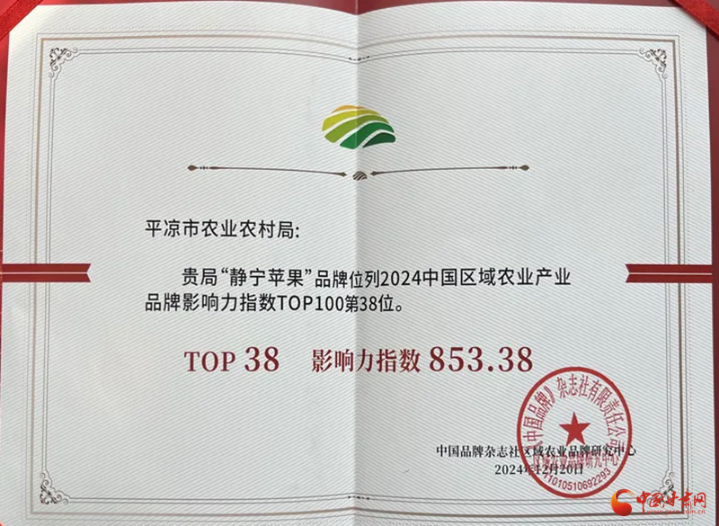 中國甘肅網12月25日訊(西北角·中國甘肅網記者 孫珩力 通訊員 胡繼萬)近日,由《中國品牌》雜志、中國品牌網主辦的2024區(qū)域農業(yè)品牌年度盛典在浙江金華舉行。會上,“靜寧蘋果”品牌榮登2024中國區(qū)域農業(yè)產業(yè)品牌影響力指數(shù)百強榜。