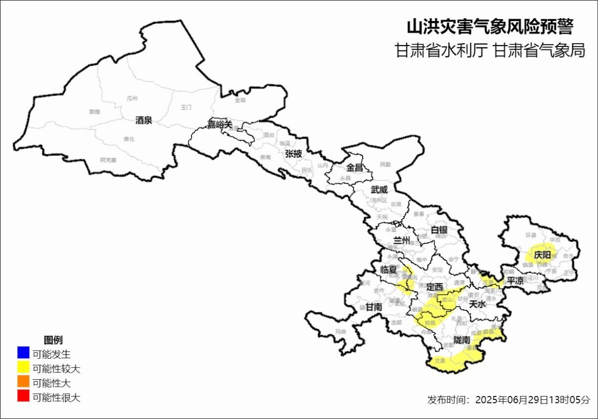根據(jù)省氣象局《重大氣象信息專報》(2025年甘氣第10期),未來十天甘肅省多降水天氣,具有對流性強、小時雨強大、累積雨量大等特點,洪水災害風險高。6月29日13時,省水利廳、省氣象局聯(lián)合發(fā)布山洪災害氣象風險預警:預計,6月29日14時至30日14時,白銀市(景泰縣),武威市(古浪縣),定西市(臨洮縣、渭源縣、通渭縣、隴西縣、漳縣、岷縣),臨夏州(廣河縣、東鄉(xiāng)縣、康樂縣),甘南州(臨潭縣、卓尼縣、舟曲縣、迭部縣),天水市(秦安縣、甘谷縣、武山縣、張家川縣),隴南市(宕縣、禮縣、武都區(qū)、成縣、文縣、康縣、徽縣、兩當縣),平?jīng)鍪校o寧縣、崆峒區(qū)、華亭市、莊浪縣),慶陽市(西峰區(qū)、慶城縣、環(huán)縣、華池縣、鎮(zhèn)原縣)等地區(qū)發(fā)生山洪災害可能性較大(黃色預警)。