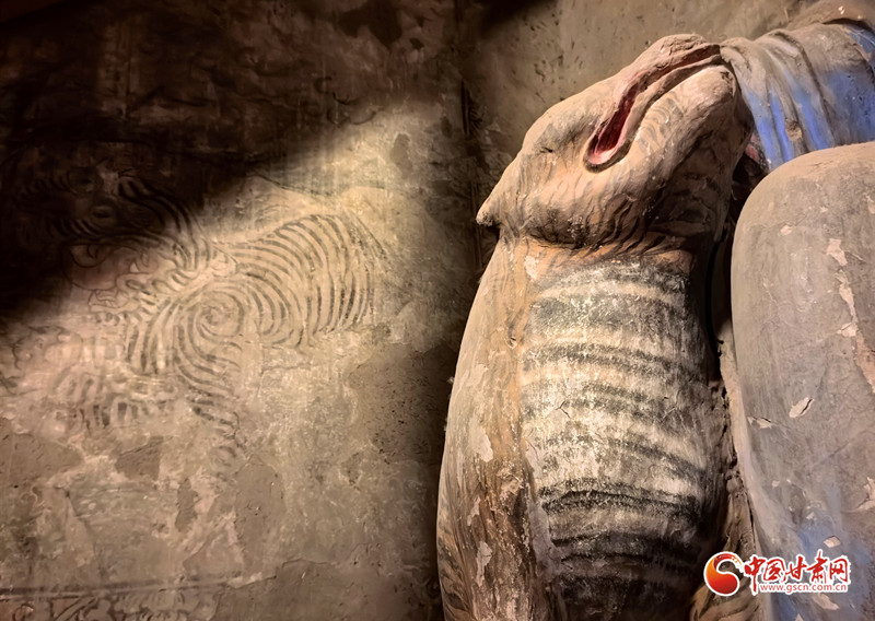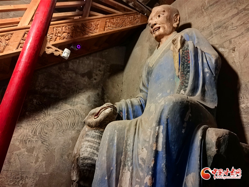 為何要將老虎塑造得如此乖巧?答案就在老虎旁邊的壁畫中。壁畫里的老虎張牙舞爪、張著大嘴,盡顯兇猛之態(tài)。而羅漢手中的老虎卻溫順如貓,這一鮮明對(duì)比,恰恰生動(dòng)地說(shuō)明了羅漢已將老虎降服。