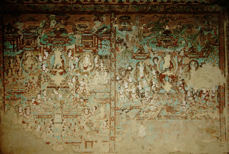 畫(huà)面中的人物造型嚴(yán)格遵循唐代仕女的畫(huà)風(fēng)繪制,顯得豐腴飽滿,恰似盛唐時(shí)期雍容華貴的氣質(zhì)寫(xiě)照。線描寫(xiě)實(shí)明快,流暢飛動(dòng),一氣呵成,仿佛是畫(huà)師用靈動(dòng)的筆觸在墻壁上勾勒出的生命樂(lè)章。畫(huà)面的顏色以石綠、赭黃、鉛白為主色。整個(gè)畫(huà)面顯得典雅、嫵媚,令人賞心悅目。雖然伎樂(lè)天頭部原本貼金的頭飾已經(jīng)剝落,但歲月的痕跡并未減損她雍容華貴的氣質(zhì),反而更增添了一份歷史的厚重感。