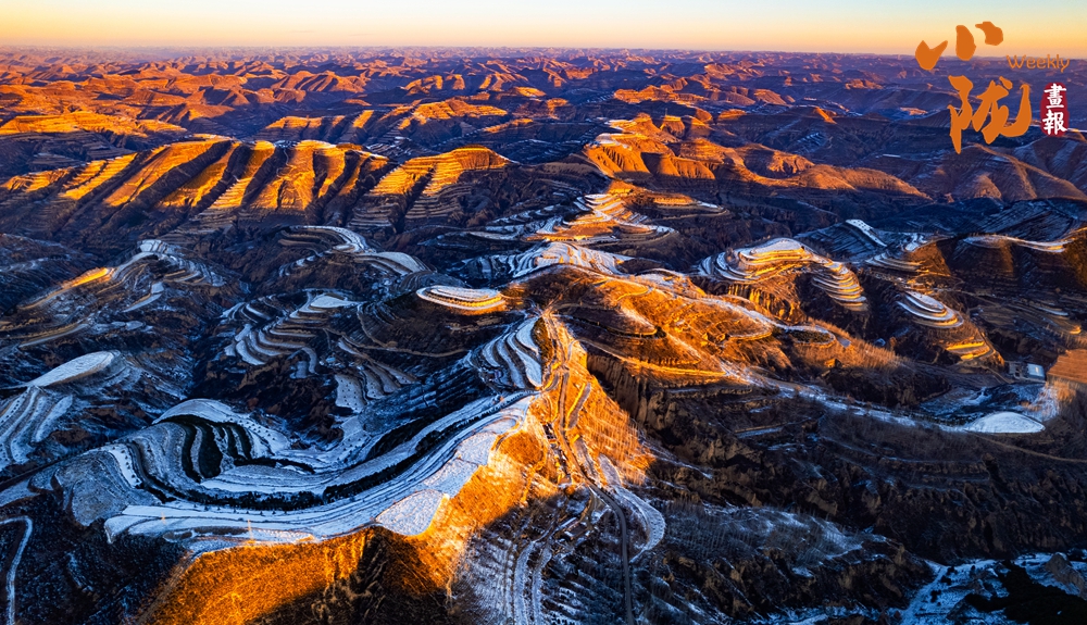 俯瞰雪后華池,溝壑縱橫的黃土高原披上銀裝,陽光斜照雪野之上,投下深淺交錯的光影,靜謐中流轉(zhuǎn)著溫柔的明暗,純凈而遼遠(yuǎn)。