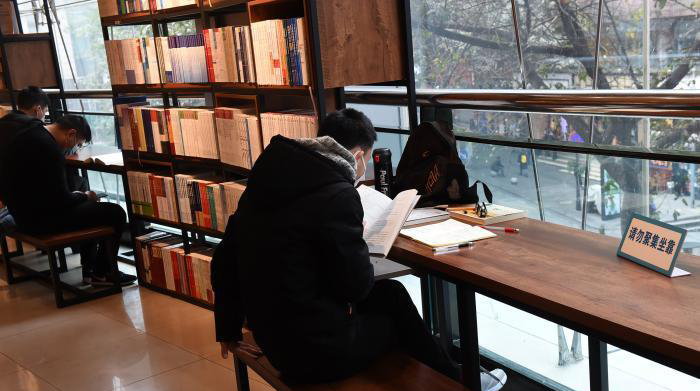資料圖:圖為重慶書(shū)城恢復(fù)營(yíng)業(yè),市民戴著口罩閱讀。 周毅 攝