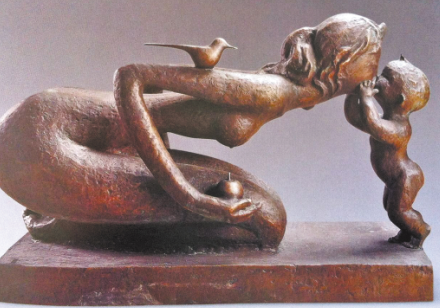 最后的廳,是一批中外馳名的雕塑代表作——從嬌小稚拙掌中把玩的小品到體量龐大高聳入云的巨構(gòu),無(wú)論隨形寫意、裝飾寫實(shí),美林都在策劃、構(gòu)成、調(diào)整、定型的繁復(fù)過(guò)程中,顯示出扎實(shí)的藝術(shù)功力與非凡的浪漫色彩。其中,龍、虎、馬、牛等動(dòng)物系列,不僅延續(xù)了繪畫中獨(dú)有的造型風(fēng)格,而且更凝重渾厚,更富裝飾情趣。與眾不同人見人愛的母子系列中,不論是精心呵護(hù)襁褓嬰兒的母親,匍匐草地引領(lǐng)學(xué)步的母親,牽手寶寶步入校園的母親,造型、肢體的夸張之奇變形之巧,感官、神態(tài)的風(fēng)韻依依顧盼有情,讓人駐足良久再三流連……